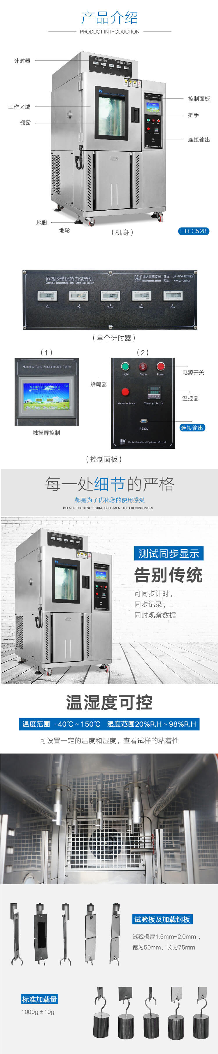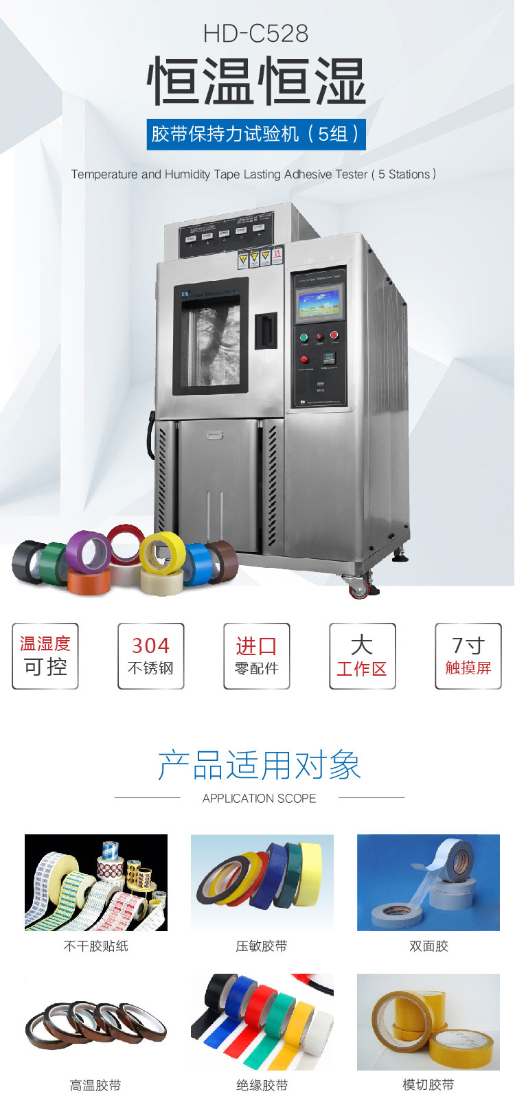恒溫恒濕膠帶保持力試驗(yàn)機(jī)主要用于測(cè)試試樣的抗粘連性,測(cè)試壓敏膠帶持粘性,靜態(tài)負(fù)荷試驗(yàn)。將膠帶粘于試驗(yàn)板上, 下端懸掛標(biāo)準(zhǔn)荷重,經(jīng)一段時(shí)間自動(dòng)計(jì)時(shí)后, 測(cè)量膠帶下滑距離或膠帶粘著時(shí)間用來評(píng)定膠帶粘著的持久性。