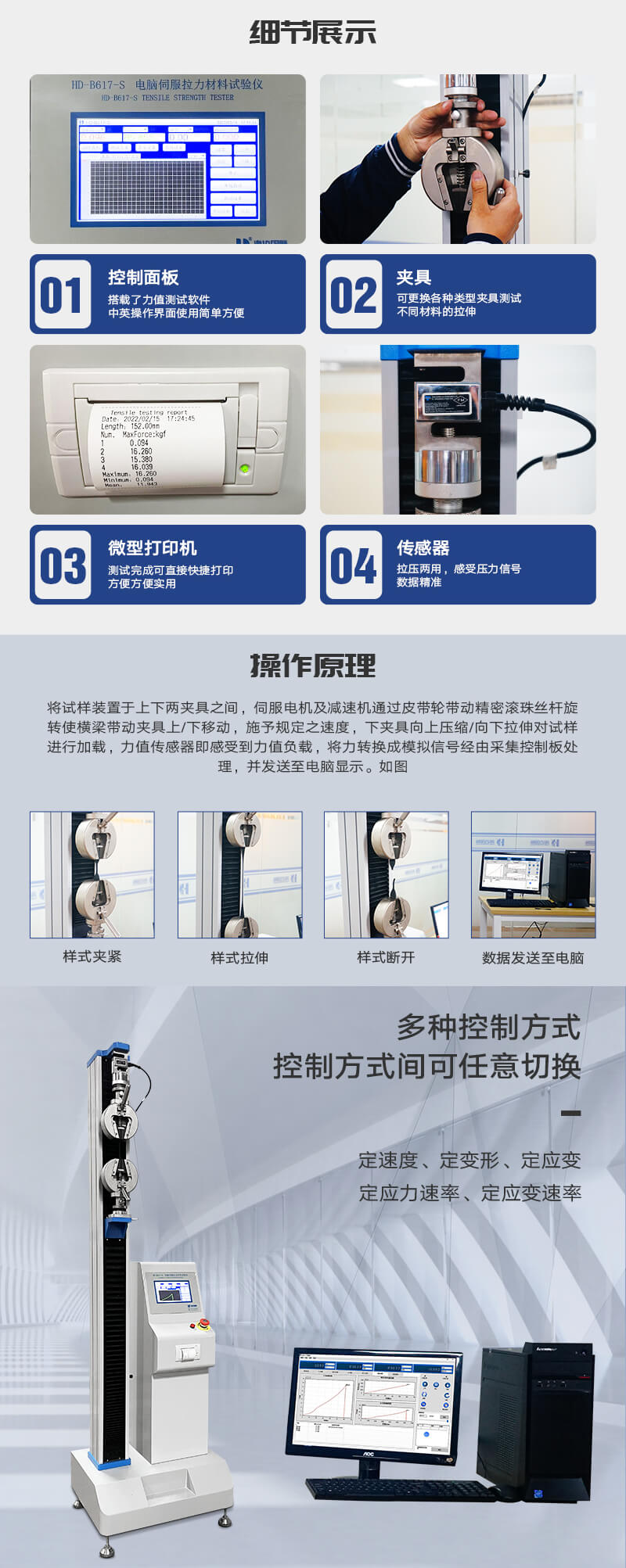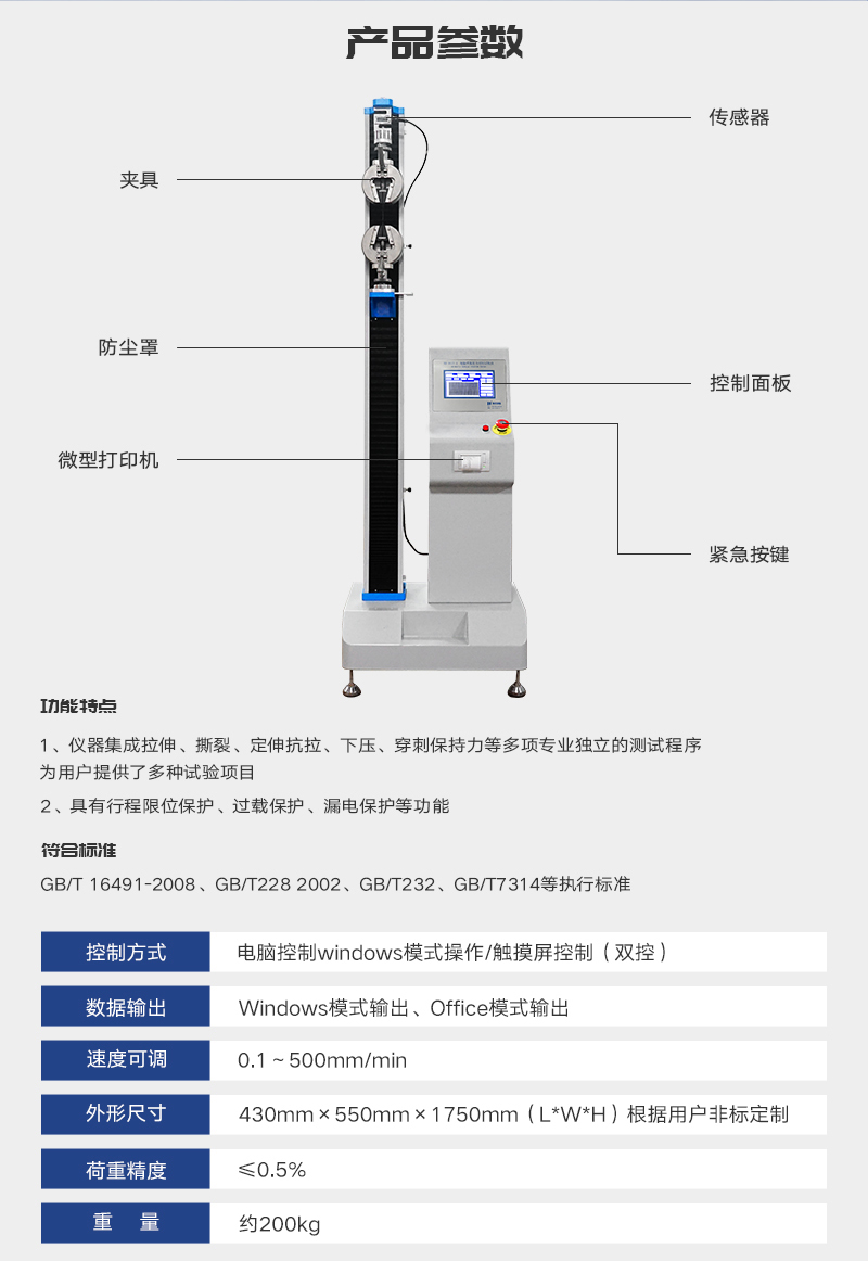 電線電纜拉力機適用于復合材料、包裝材料、塑料管、膠粘劑、背板材料、無紡布、混凝土、橡膠等非金屬材料和醫療器械、線纜、鋼材等金屬產品的拉伸、抗彎、壓縮、膠合強度、撕裂、穿刺力、開啟力、解卷力、拔開力等性能測試。