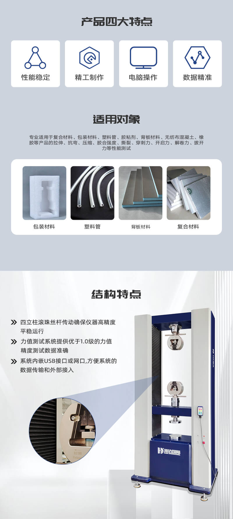 金屬材料萬能拉力機適用于復合材料、包裝材料、塑料管、膠粘劑、背板材料、無紡布、混凝土、橡膠等高強度非金屬材料和醫療器械、線纜、鋼材等金屬產品的拉伸、抗彎、壓縮、膠合強度、撕裂、穿刺力、開啟力、解卷力、拔開力等性能測試。