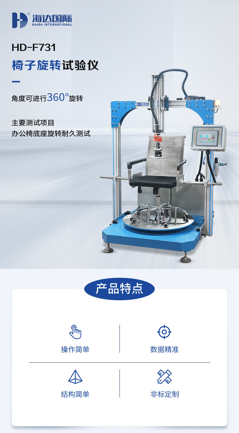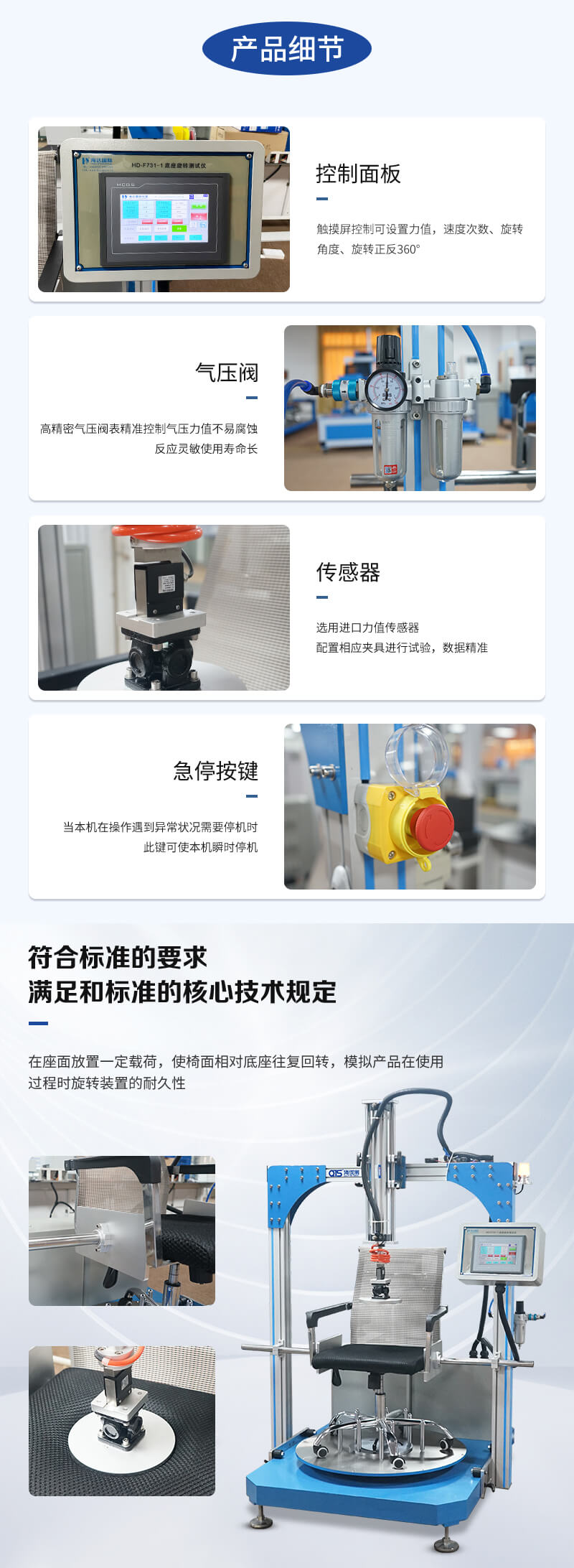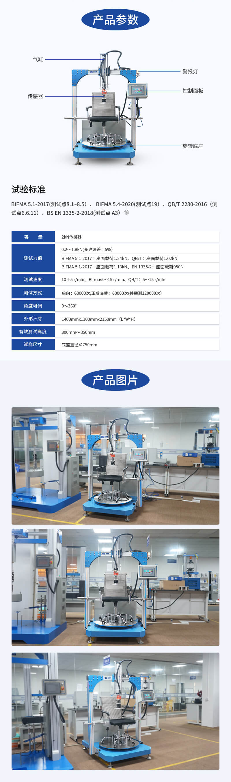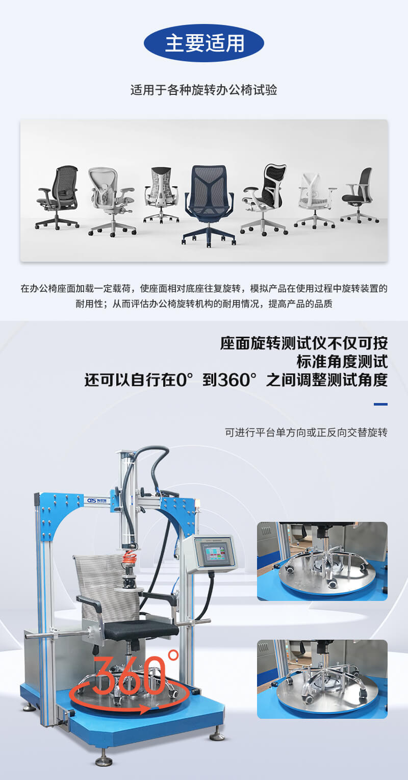 椅子旋轉(zhuǎn)試驗機適用于辦公椅重復(fù)旋轉(zhuǎn)試驗,在辦公椅座面加載一定載荷,使座面相對底座往復(fù)旋轉(zhuǎn),模擬產(chǎn)品在使用過程中旋轉(zhuǎn)裝置的耐用性;從而評估辦公椅旋轉(zhuǎn)機構(gòu)的耐用情況,提高產(chǎn)品的品質(zhì)。
