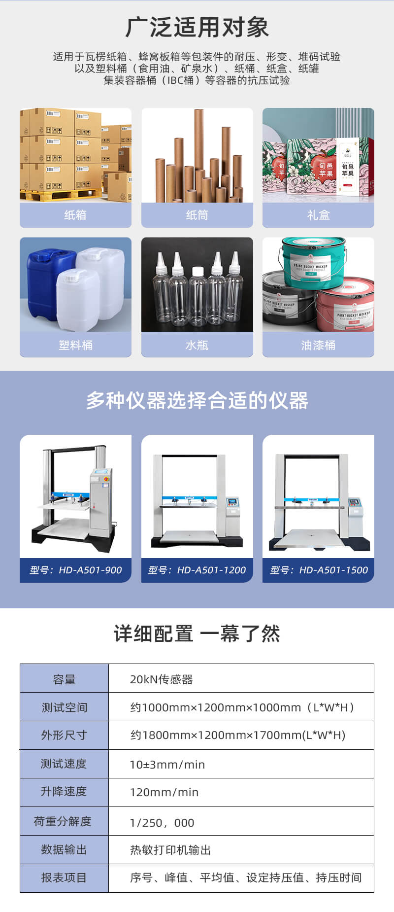 該儀器是專業用于測試紙箱抗壓性能的試驗機,適用于瓦楞紙箱、蜂窩板箱等包裝件的耐壓、形變、堆碼試驗,以及塑料桶(食用油、礦泉水)、紙桶、紙盒、紙罐、集裝容器桶(IBC桶)等容器的抗壓試驗。